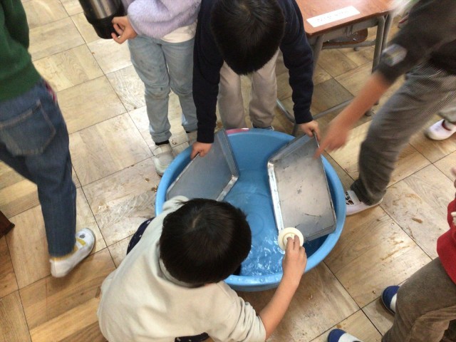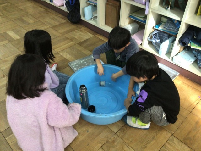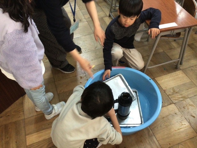 『くらべかた』の学習で、水のかさについて学習していました。どの水筒にたくさん水が入るのかという問題に対して、見通しをもった後に、コップ何杯分水が入るのかを調べていました。子どもたちはこの「コップ何杯分」で水筒に入る水のかさを比べていました。