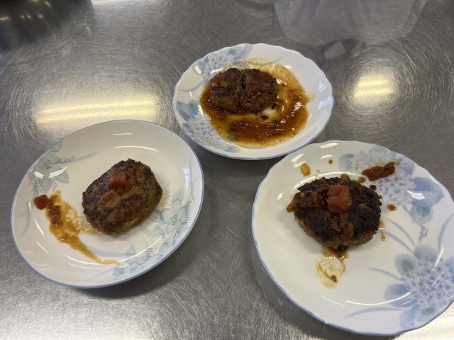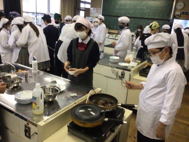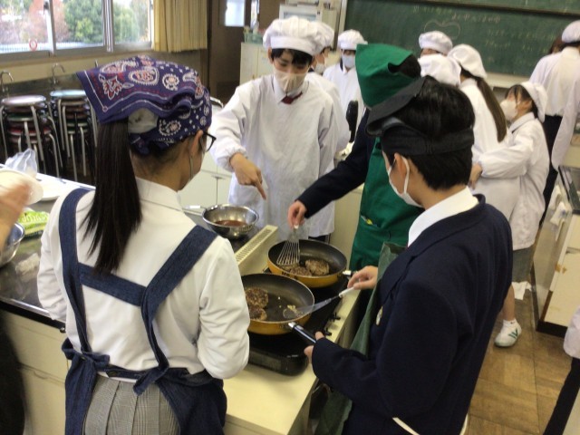 7年生 家庭科の調理実習で、煮込みハンバーグを作りました。みんなで協力して、時間内に美味しいハンバーグができました。