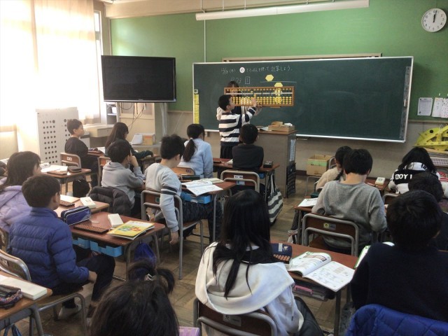 今日はそろばんを使った学習をしていました。子どもたちは筆算と違ってそろばんは上の位から計算することに驚いていました。「3+4」などの五玉と一玉を使うたし算の方法について、友だちの発表を聞いた子どもたちが、