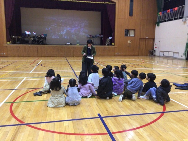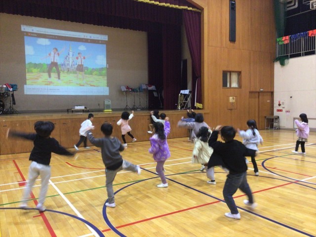 「クリスマス会」と題して、体育館で楽しんでいました。上のダンスをしている画像は、『ジャンボリミッキー!』を踊っている様子です。