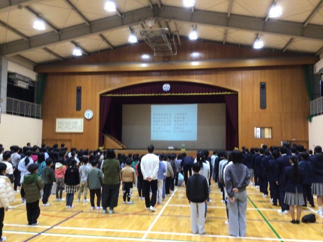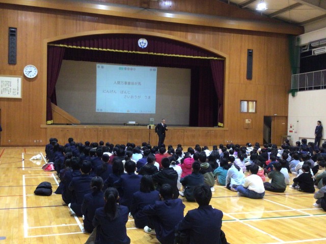 体育館で3学期の始業式を行いました。全員で校歌を歌い、校長先生から午年にちなみ、「人間万事塞翁が馬」のお話がありました。3学期はまとめの学期であり、新しい学年になる準備の学期でもあります。お正月明けで日常のリズムが戻ってない人もいるかもしれませんね。体調を整え、寒さに負けず頑張りましょう。