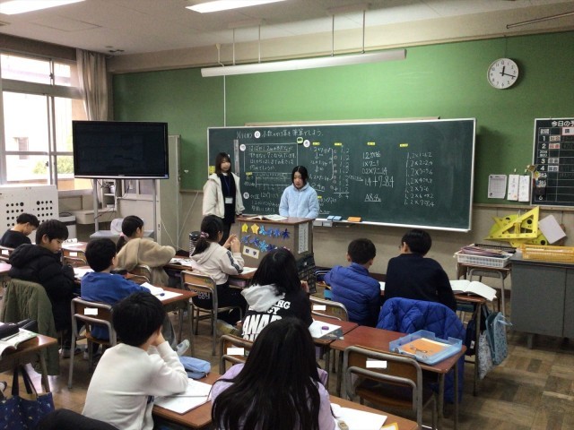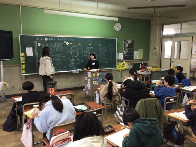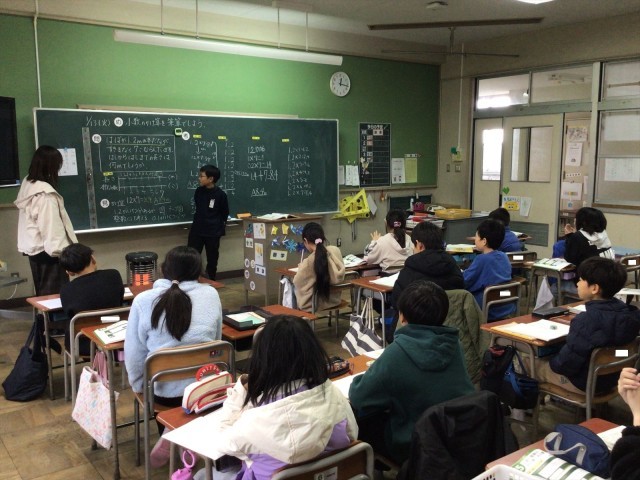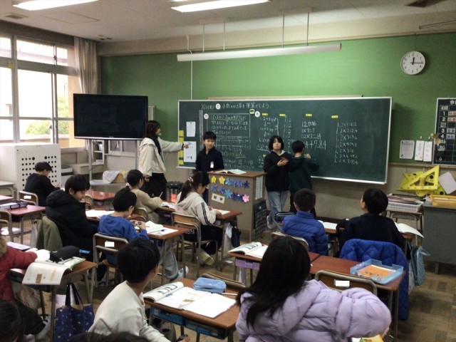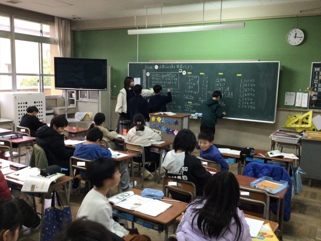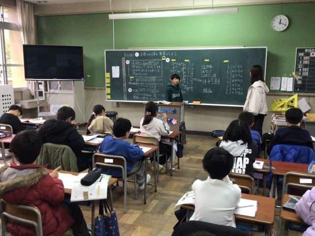 小数のかけ算について学習していました。子どもたちは文章問題を読み、どのような方法で計算をしたら答えを出すことができるのかを考えてノートに書きました。子どもたちは様々な方法で考えていて、授業の後半では、6人の子どもたちが一生懸命発表し、担任の先生も丁寧に解説していました。