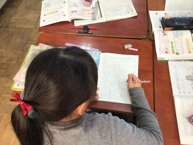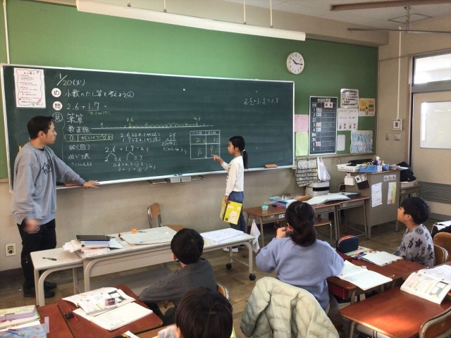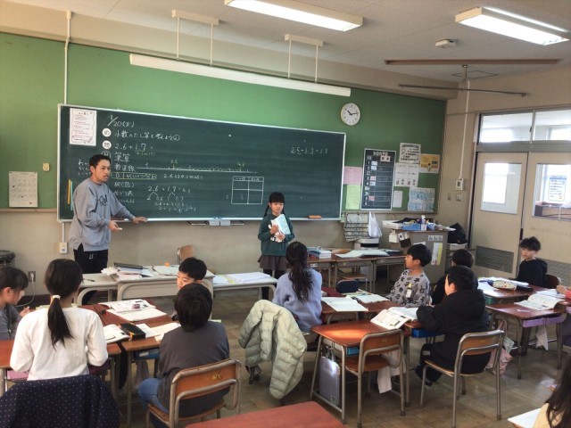 小数のたし算の仕方について学習していました。子どもたちは、絵や図、数直線、位取り表、筆算など、様々な方法で一生懸命考えて発表していました。子どもたちは友だちの発表を聞いたり、先生からの質問を考えたりしながら、位をそろえて計算しなければならないことを学んでいました。