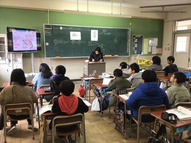 子どもたちは台形の面積をどのようにして求めたのかを発表していました。先生は子どもたちの発表内容をすぐに大型モニターに映し、全員で共有できるようにしていました。子どもたちが発表してくれた面積の求め方から、台形の面積の公式について考えます。