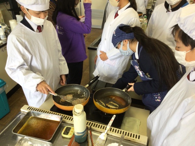 7年生は調理実習で「イワシのかば焼き」を作りました。教室からはいい匂いが…。手際よく進み、美味しくできあがりました。