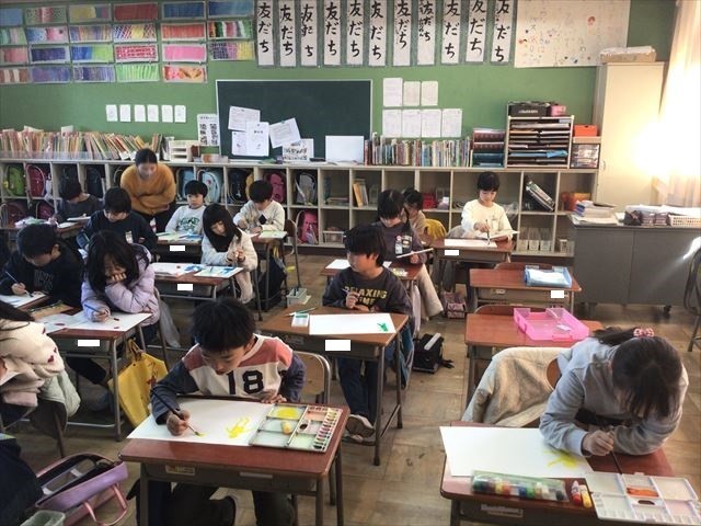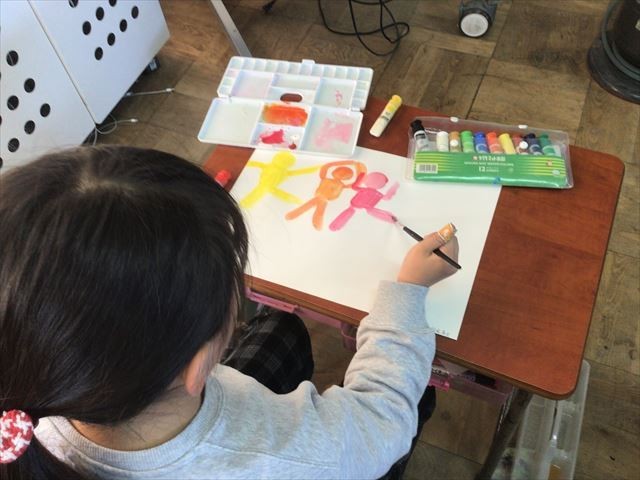 子どもたちは、『おもしろポーズ』をテーマに、想像力を働かせながら絵を描いていました。色にこだわり、いろいろな混色を作っている子や、筋肉量を考えながらポーズをとっている人の絵を描いている子など、子どもたちは様々なことを考えながら絵を描いていました。