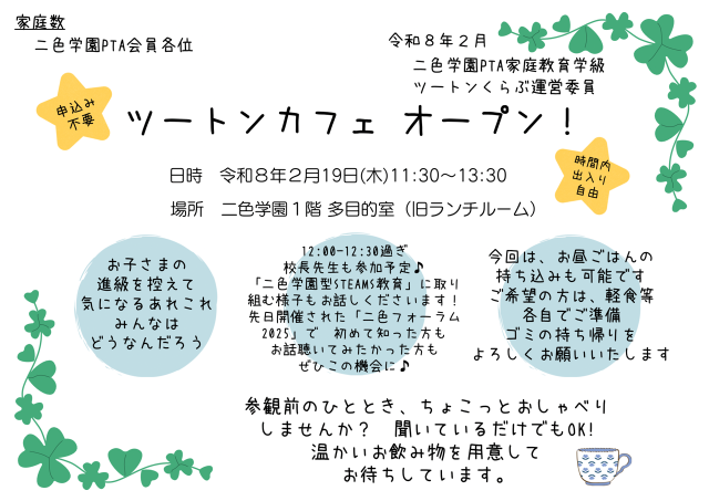 『ツートンカフェ』が今年もオープンします。参観前のひと時、ちょこっとおしゃべりしませんか?詳しくは案内ビラをご参照ください。