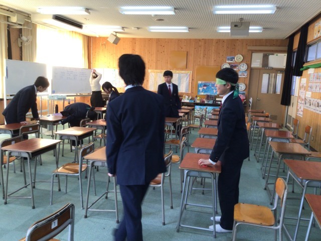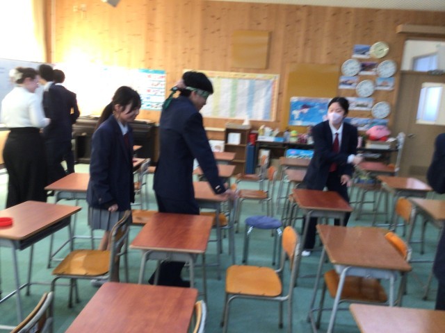 昼休みの二色English dayの時間に、後期課程の生徒が英語でゲームを楽しみました。1人が目隠しをし、机の上に置いた文字のブロックを探します。ペアの生徒は英語で方向を教えてあげます。どのチームもブロックを見つけることができて、盛り上がっていました。