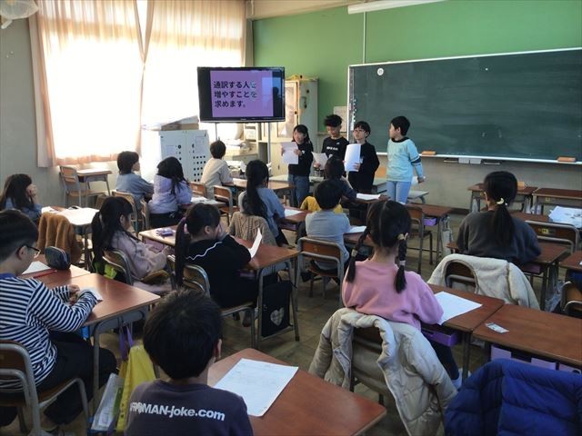 3年生の子どもたちは総合的な学習の時間に、今まで学習してきたことを振り返り、二色校区を今以上にさらに住みよいまちにするためにできることはないかを考えてきました。今日は、これまで子どもたちが考えてきたことを貝塚市役所の方に聞いていただきました。貝塚市役所の方は、子どもたちの貴重な意見を大切にして、市役所内の様々な課の方に伝えますと語ってくださいました。また、3年生の子どもたちは来年度は前期課程6年間の後半に入るので、下級生が困っていたりしたら、今回の学習を活かして、どうしたら解決するのかを考えて上級生や先生に提案してほしいと話してくださいました。子どもたちは真剣な表情でお話を聞いていました。