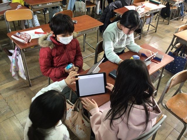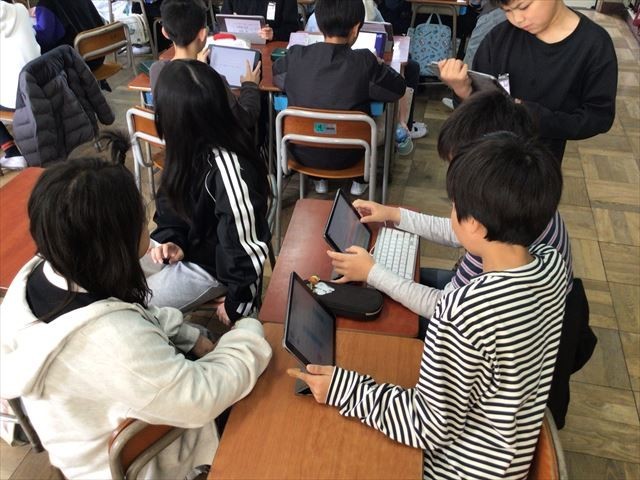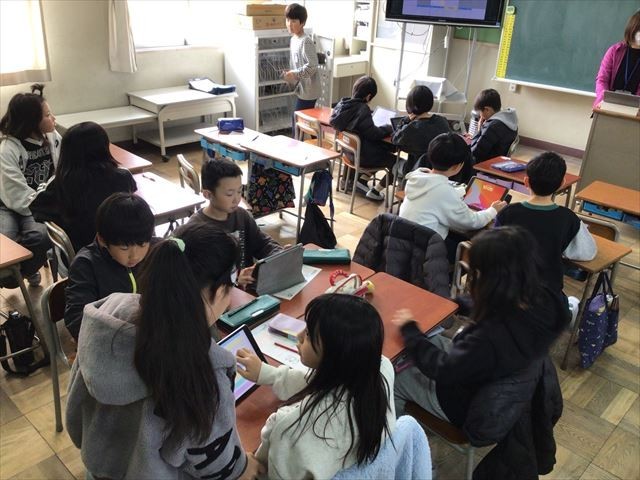 子どもたちはタブレット端末を活用して学級の友だちにアンケートに答えてもらい、その結果をグループでまとめていました。この結果を活用して、グループごとに自分たちの意見をまとめ、発表をします。