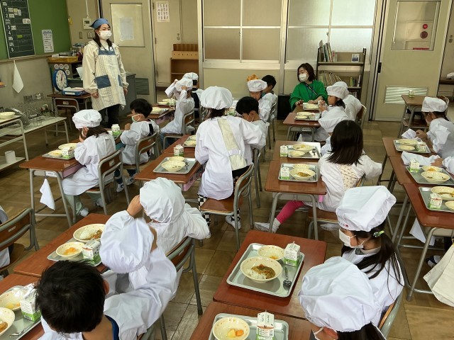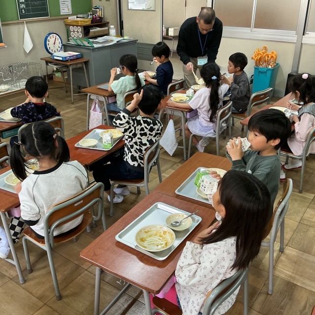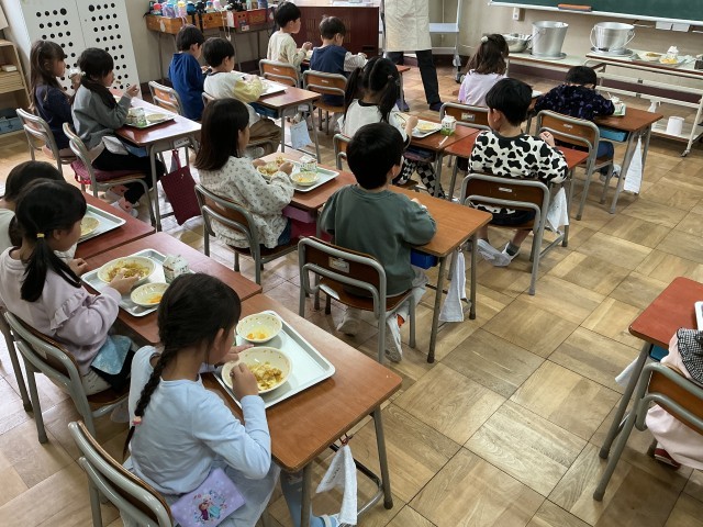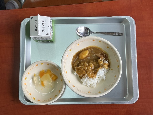 今日から給食がはじまりました。1年生にとって、はじめての給食です。全員でエプロンを着用し、先生方にお手伝いしてもらいながら、慎重に食缶やそれぞれのおぼんなどを運んでいました。そして「いただきます!!」 メニュ-は人気のカレ-ライスとフル-ツコンポ-ト、牛乳でした。みんなしっかりと食べ、おかわりをする子もいました。これから9年間、給食を食べていきますが、その記念すべき第一歩でした。