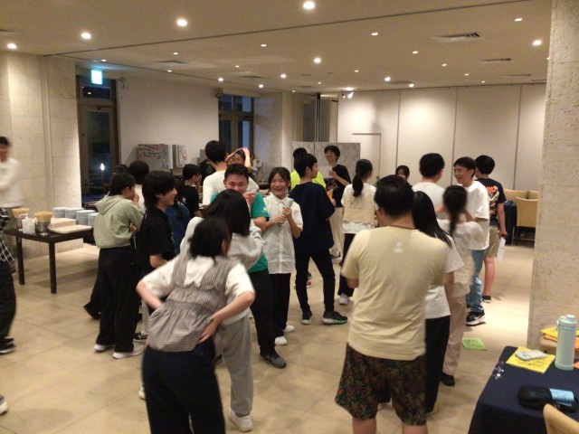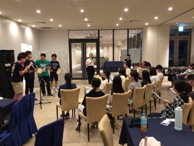 夕食後 レクリエーション大会 ゲームをしたり三線を伴奏に沖縄の歌を歌ったり大盛り上がりでした
