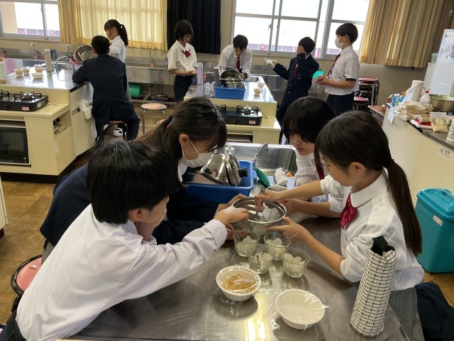 7年生と8年生が、それぞれ調理実習を行いました。7年生は「わらび餅」を、8年生は「うどん」を生地からつくりました。班で協力して、てきぱき作業していました。
