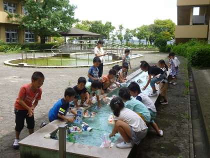 2組は図工です。「みずにうくおもちゃ」を作って、噴水広場の水槽に水をはって、浮かせて遊びました。