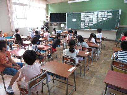 1年生は、算数で答えが6になる式をさがし、問題を出し合っています。