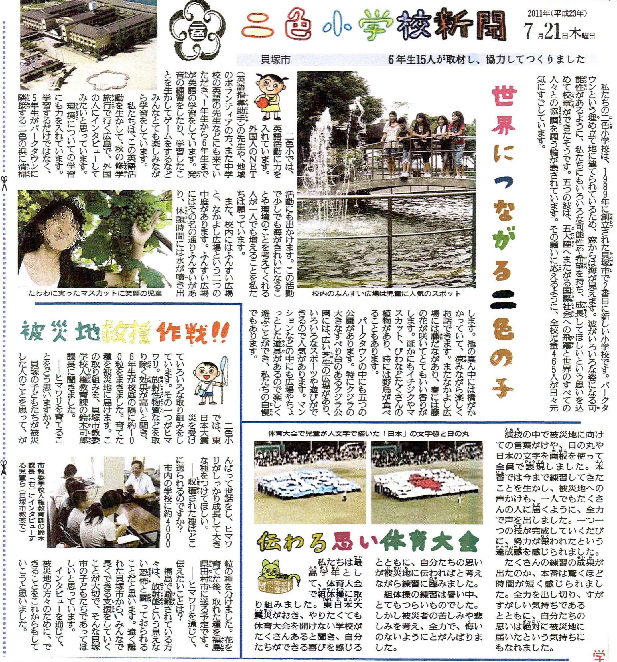 8/24 に7月21日発行の読売新聞を全校児童に配布いたしました。この新聞の堺・泉州版に「二色小学校新聞」が掲載されています。この取り組みで、6年生の有志15名(互選)が、学年の先生たちや読売新聞の記者の指導のもと、子どもたち自身の手で、自分たちの学校を紹介する新聞を作り上げました。どうぞお子さまとご一緒にご覧ください。二色小学校について新たな発見があるかもしれません。
