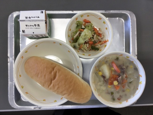 今日の給食は、「クリームシチュー、野菜ソテー、コッペパン」でした。今日もおいしくいただきました。