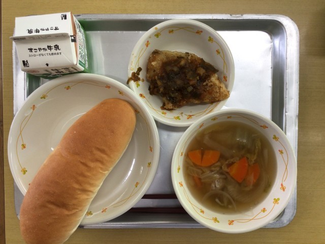 今日の給食は、「白身魚のバーベキューソース、白菜スープ、コッペパン」でした。みんなで美味しくいただきました。