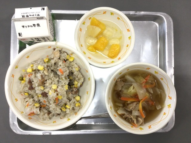 今日の給食は、「コーンピラフ、キャベツスープ、フルーツコンポート」でした。今日もおいしくいただきました。