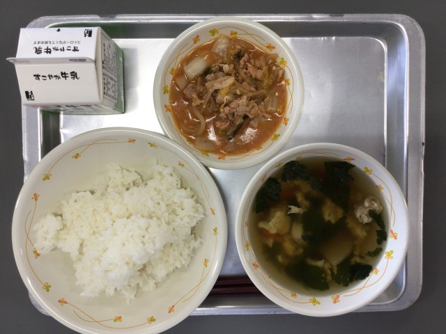 今日の給食は、「豚キムチ、かきたま汁、ごはん」でした。