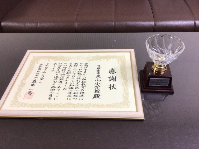 本校では、毎年6年生を対象に租税教室を実施したり、税に関する作品コンクールへ出品したりと、税について学ぶ取り組みを続けてきました。こうした積み重ねを評価していただき、岸和田税務署より感謝状をいただきました。今回の表彰を励みに、これからも児童の学びを大切にしていきたいと思います。