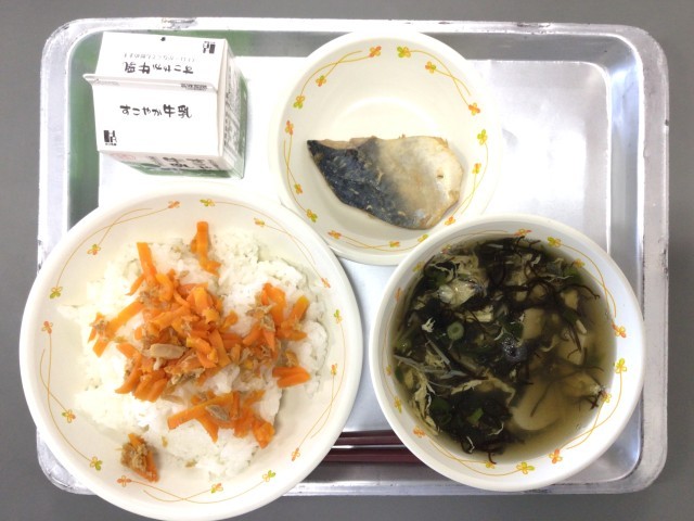 今日の給食は、「さばの味噌煮、もずくのすまし汁、ごはん、にんじんしりしり」でした。