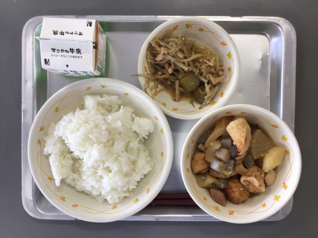 今日の給食は、「関東煮、もやしのナムル、ごはん」でした。