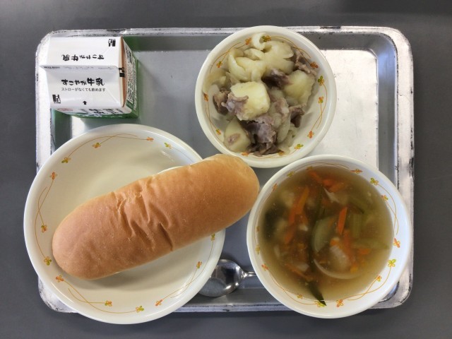 今日の給食は、「ベーコンポテト、鶏ひき肉のとろみスープ、コッペパン」でした。