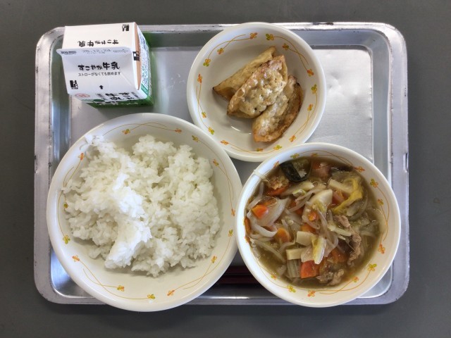 今日の給食は、「八宝菜、揚げ餃子、ごはん」でした。