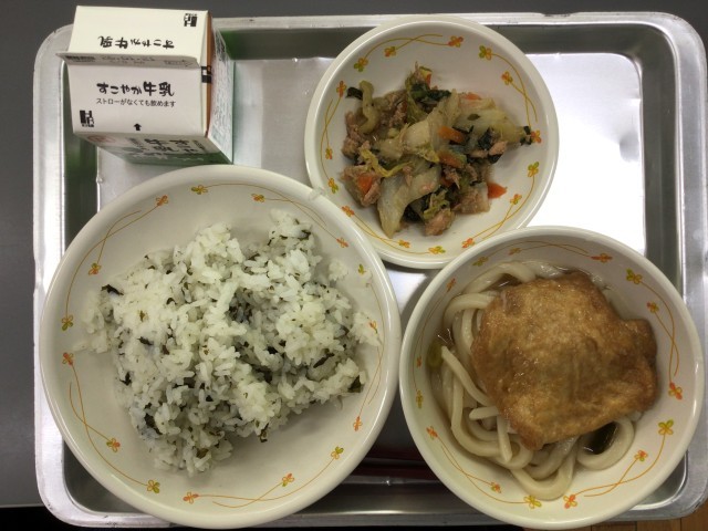 今日の給食は、「わかめごはん、きつねうどん、ツナ入りおひたし」でした。