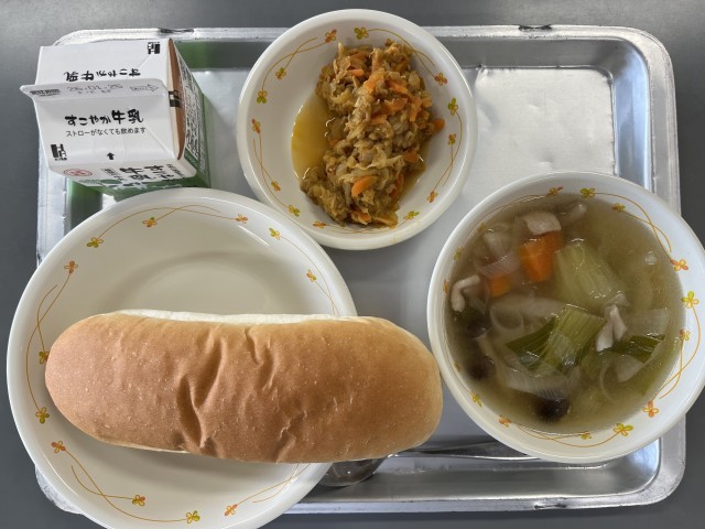 今日の給食は、「セルフツナドッグ(小おかずをコッペパンにはさむ)、大根と鶏肉のスープ」でした。