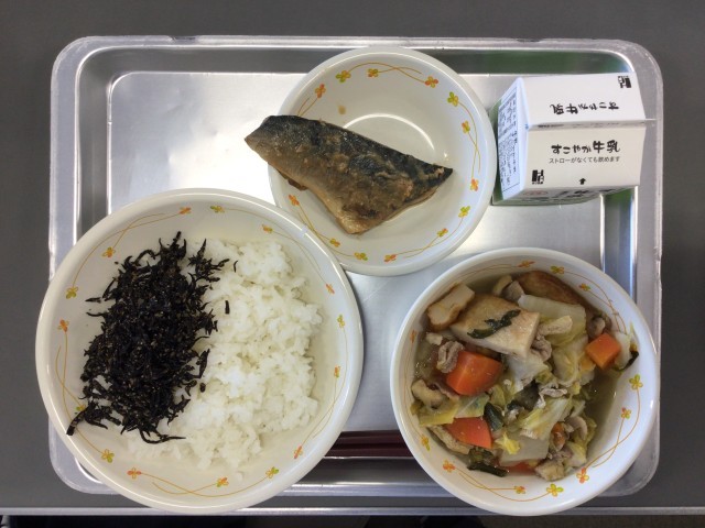 今日の給食は、「さばのみそ煮、白菜の煮物、ごはん、ひじきふりかけ」でした。
