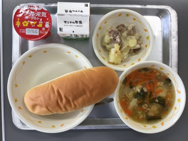 今日の給食は、「ベーコンポテト、鶏ひき肉のとろみスープ、コッペパン、ヨーグルト」でした。
