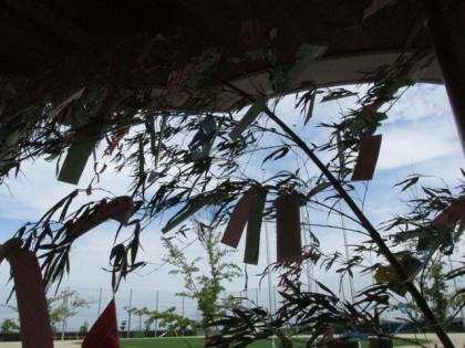 7月1日に、あおぞら学級の子どもたちと2年生が、七夕かざりをつくりました。その後、全児童がそれぞれの願い事をかいた短冊を、笹にくくりつけました。2日に、七夕集会をして、玄関に笹をかざりました。みんなの願い事がかないますように……
