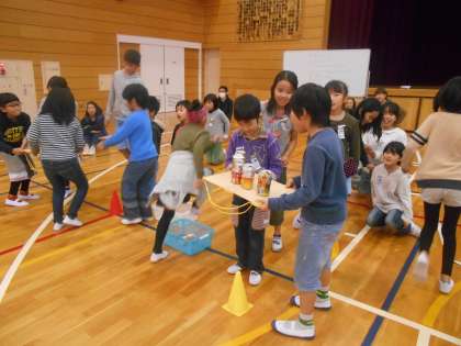 5時間目、あおぞら学級と4年生の児童で、缶積みリレーをして楽しみました。