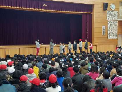 今日の集会では人権作品(図画と書写)と校内自主学コンテストの2つ表彰がありました。