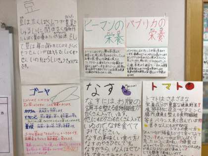 11月の給食目標は、「好ききらいしないで、なんでも食べよう」です。給食委員会のみなさんが、いろいろな野菜の良いところをまとめてくれています。みなさん、給食は残さず食べていますか。