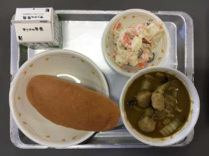 今日の給食は、「カレー鍋、ポテトサラダ、コッペパン」でした。今日も美味しくいただきました。