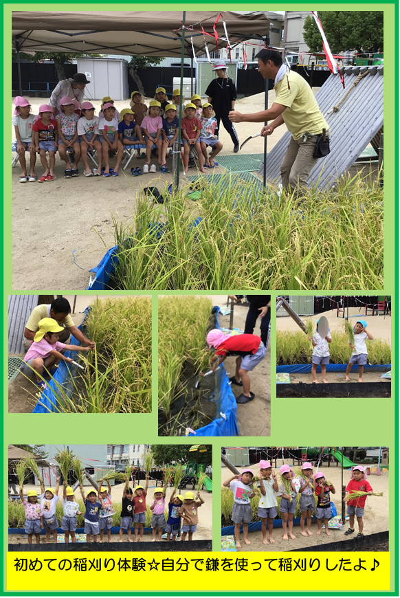 畑の先生から稲刈り用の鎌の持ち方、稲の切り方などを丁寧に教えていただいた後、早速子どもたちが稲刈りに挑戦します☆