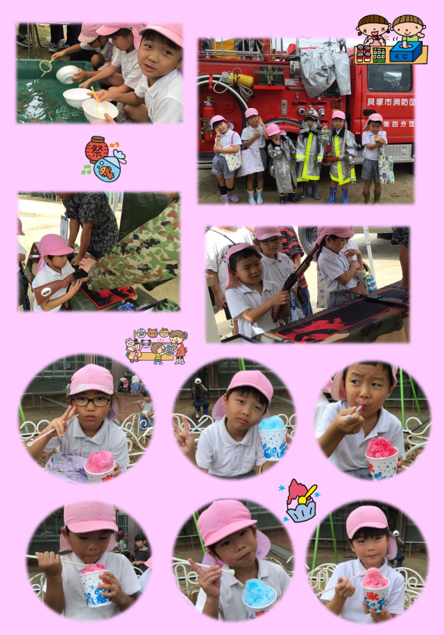 運動場には、ひもひき・スマートボール・金魚すくい・スーパーボールすくいなどのゲームコーナーがたくさんありました。他にもかき氷屋さんや、消防自動車の展示など、子どもたちにとって、ワクワクするような世界が広がっていました。