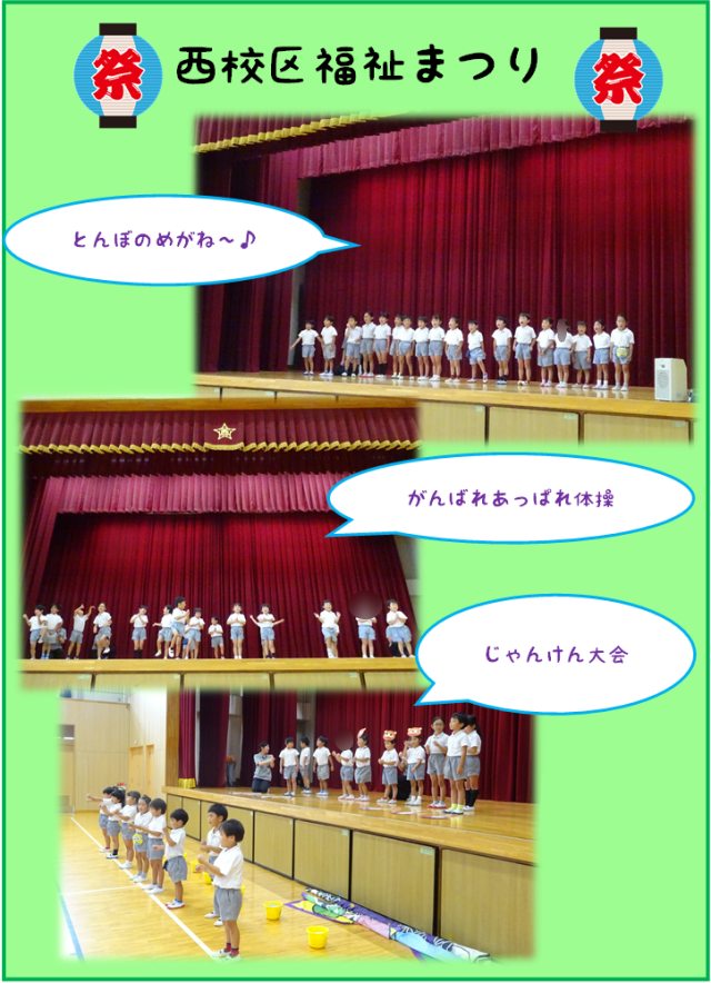 そこでは西幼稚園の子どもたちが舞台に上がり、「とんぼのめがね」の歌をうたったり、元気いっぱい体を動かして体操をしたりしました。