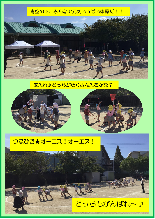 体操、かけっこ、リレー、玉入れ、つなひきなど、いろいろな動きを友だちと一緒に楽しんだ子どもたち♪