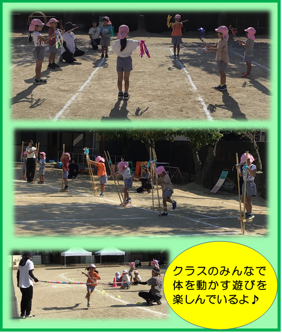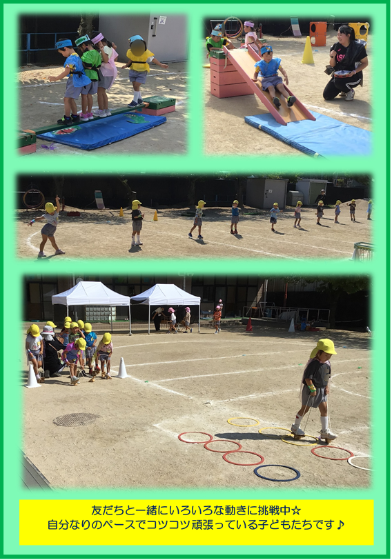 今日は天気がとても良かったので、クラスの友だちと一緒に楽しく踊ったり、自分なりの目的に向かって一生懸命、挑戦したりなど、心も体もめいいっぱい動かしていた子どもたちです。