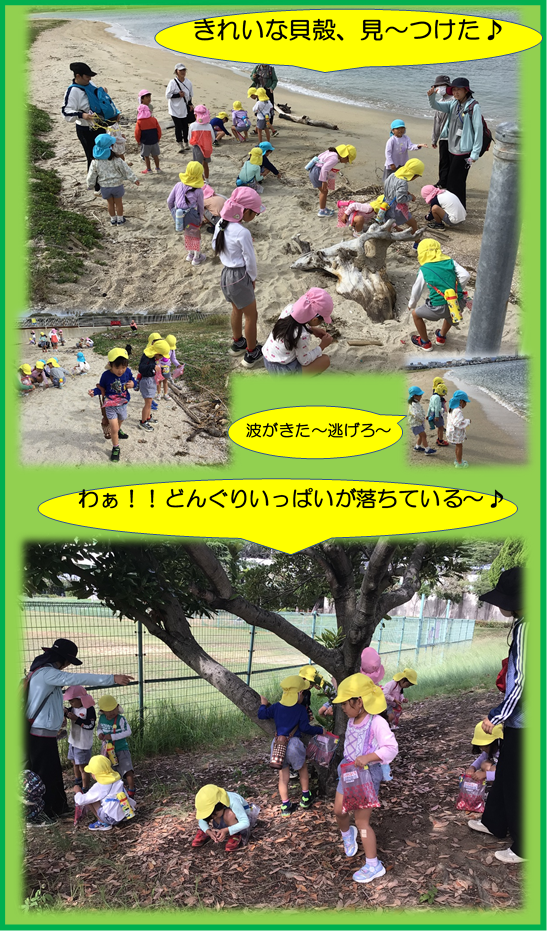 他にもきれいな貝殻をたくさん拾ったり、いろいろな大きさのどんぐりを探したりなど、自然とおもいきり触れ合って遊んできた子どもたちでした♪