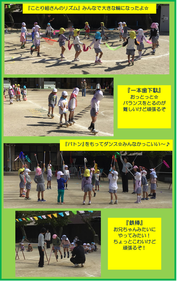 その後は、ことり組のリズムや一本歯下駄、はな組のバトンを持ったダンスや大縄跳びなどにみんなで挑戦です。「ことり組さんやはな組さんみたいに出来た♪」「ことり組さんの一本歯下駄ってこんなに難しいんやな…」「はな組さんの大縄跳び、すごいな~」など、自分たちが体験して初めて気付いたこともたくさんあった子どもたちです☆