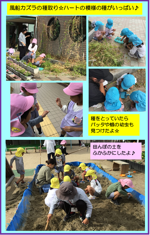 風船カズラの種を収穫している横で、硬くなった田んぼの土をスコップで掘り起こし、ふかふかにしてくれている子どもたちもいました。この田んぼに次は〇〇の種を植える予定です♪〇〇はまた今度報告させていただきますね☆