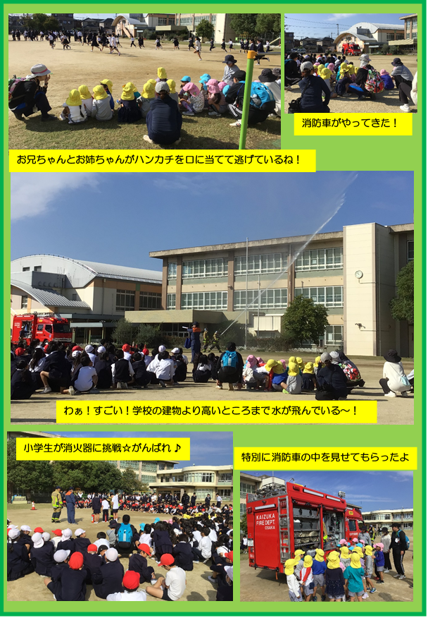 今日は、西小学校の先生から「消防車が来て避難訓練をするので、幼稚園のみんなも避難訓練に来ませんか?」と連絡をいただいたので、幼稚園でも火災の避難訓練を少ししてから西小学校に出かけました。