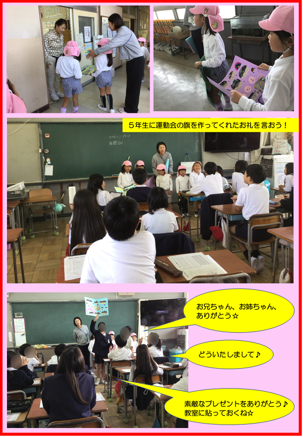今日は、はな組が幼稚園を代表し、運動会の旗を作ってくれた5年生の教室を回り、お礼を伝えてきました。