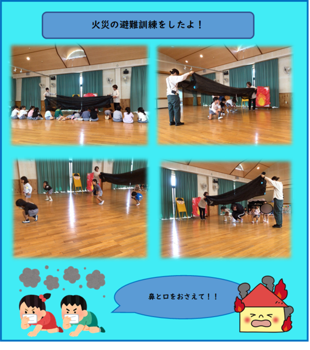 火や煙の恐ろしさについてや、煙を吸わないように口と鼻を押さえたり、姿勢を低くして逃げたりするなど、様々なポイントを子どもたちに伝えました☆