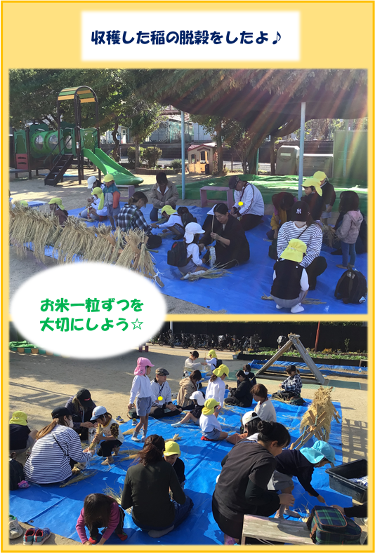 今日はことり組とはな組が保護者の方と一緒に体験します。牛乳パックにお米がついた稲を入れ、ふたを閉めてスルスルと稲を引き抜くとお米がパラパラと取れていきます☆